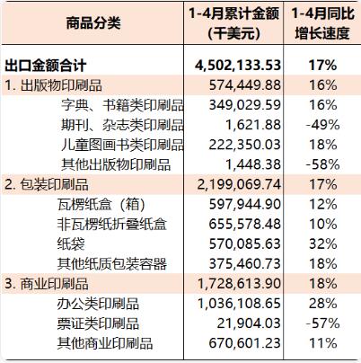 同期,相關印刷品主要子項進口,字典書籍類印刷品9489.21萬美元(同比下降18%)、期刊雜志類印刷品9417.44萬美元(同比增長306%)、兒童圖畫書類印刷品47.01萬美元(同比下降78%)、瓦楞紙盒(箱)1089.06萬美元(同比下降17%)、非瓦楞紙折疊紙盒1451.87萬美元(同比下降22%)、紙袋1131.97萬美元(同比下降36%)、辦公類印刷品6256.80萬美元(同比增長5%)、票證類印刷品3.34億美元(同比下降11%)、其他商業印刷品1.62億美元(同比下降9%)。 2022年1-4月,國內印刷品出口45.02億美元(參見表9),同比增長17%。其中,出版物印刷品出口5.74億美元(同比增長16%)、包裝印刷品出口21.99億美元(同比增長17%)、商業印刷品出口17.29億美元(同比增長18%)。 表9 2022年1-4月國內印刷品出口統計