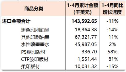 相關設備主要子項出口,膠印機4339.35萬美元(同比增長79%)、凹版印刷機1688.72萬美元(同比下降6%)、柔版印刷機3287.93萬美元(同比增長56%)、絲網印刷機2743.90萬美元(同比下降8%)、凸版印刷機1847.56萬美元(同比增長33%)、數字印刷機2.46億美元(同比下降8%)、印刷輔機和零件1.01億美元(同比增長16%)、書刊裝訂設備881.21萬美元(同比下降20%)、包裝印后設備1.71億美元(同比增長21%)。 2022年1-4月,國內印刷裝備進出口貿易順差2.37億美元(同比增長241%)。 印刷器材 2022年1-4月,國內印刷器材進口1.44億美元(參見表12),同比下降11%。其中,黑色印刷油墨510.80噸、1836.44萬美元(同比下降14%)、其他印刷油墨2522.98噸、6732.18萬美元(同比下降11%)、水性噴墨墨水2316.02噸、4598.71萬美元(同比增長2%)、PS膠印版材0.65萬平方米、33.67萬美元(同比增長58%)、CTP膠印版材2.68萬平方米、155.14萬美元(同比下降81%)、柔印版材19.77萬平方米、1003.13萬美元(同比下降15%)。 表12 2022年1-4月國內印刷器材進口統計