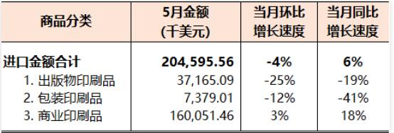2022年1-5月國內印刷器材進出口貿易順差3.15億美元(同比增長104%)。 本期觀察 2022年1-5月國內印刷產業相關商品進出口同比增長10%,與上期(1-4月)相比,提升了2個百分點。而拉動其提升的主要動力來自印刷品、印刷裝備、印刷器材三大類商品的出口增長。 本期,國內印刷產業相關商品進出口貿易特點如下: 三大類商品進口速度相對萎縮的態勢未見根本改觀:1-5月份,國內印刷產業相關商品進口同比下降12%。其中,印刷品進口同比下降1%(較上期上升2個百分點)、印刷裝備同比下降23%(較上期降低2個百分點)、印刷器材同比下降9%(較上期提高2個百分點)。 印刷品、印刷器材出口繼續大幅增長、印刷裝備出口增長速度由負轉正:1-5月份,國內印刷品和印刷器材的出口同比增長速度分布為19%和41%。同時,國內印刷裝備出口由上期的負增長(-1%)轉變為正增長(2%)。 亞洲、歐洲和北美的市場穩固,拉美和非洲市場增長顯著:1-5月份,國內印刷品、印刷裝備、印刷器材進出口在亞洲、歐洲和北美洲三大區域市場的分布相對穩定(亞洲43%、歐洲22%、北美洲24%)。與去年同期相比三個市場相關進出口增長情況為,亞洲2%、歐洲10%、北美洲增長19%。同時,在拉丁美洲和非洲市場,國內印刷產業相關商品進出口表現亮眼,其增長速度分別達到35%和16%。 與2021年同期相比,2022年1-5月國內印刷品、印刷裝備、印刷器材進口和出口增長較快的前五個商品商品類別如下: 進口:期刊及雜志類印刷品(+247%)、PS膠印版材(+125%)、柔版印刷機(+42%)、辦公類印刷品(+8%)、水性噴墨墨水(+1%); 出口:膠印機(+59%)、CTP膠印版材(+54%)、PS膠印版材(+49%)、柔版印刷機(+41%)、紙袋(+34%)。 同期,國內印刷品、印刷裝備、印刷器材進口和出口相對萎縮的前五個商品商品類別如下: 進口:凸印機(-98%)、兒童圖畫書類印刷品(-82%)、CTP膠印版材(-78%)、其他出版物印刷品(-71%)、包裝印后設備(-55%); 出口:其他出版物印刷品(-62%)、票證類印刷品(-58%)、期刊及雜志類印刷品(-39%)、柔印版材(-14%)、書刊裝訂設備(-13%)。