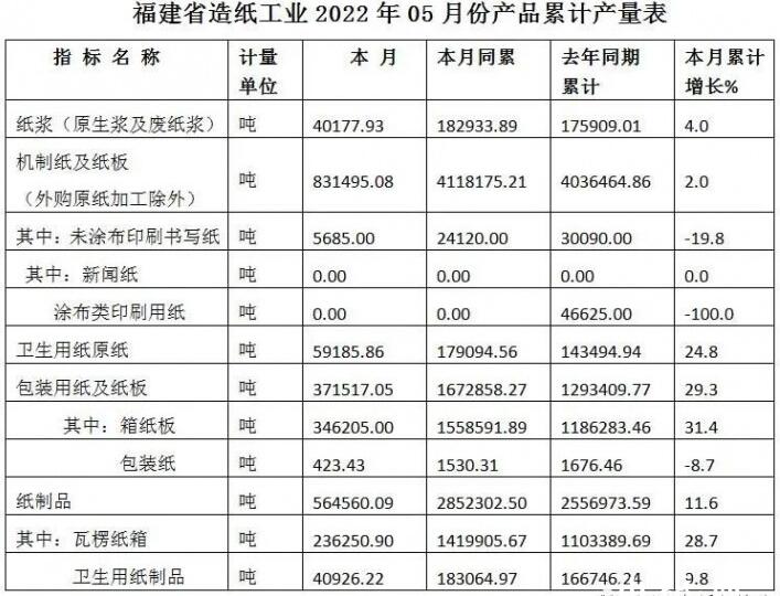 福建省造紙工業(yè)2022年05月份產(chǎn)品累計產(chǎn)量、產(chǎn)銷及出口情況