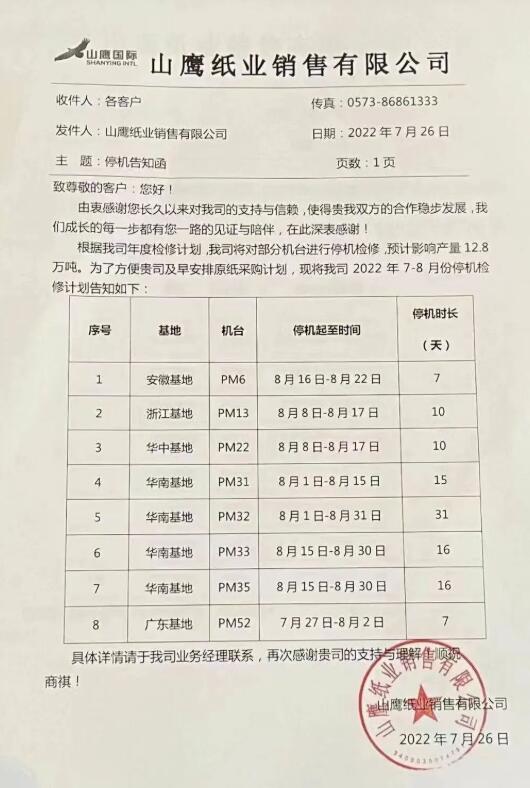 同日,山鷹國際亦發布了停機檢修通知,其安徽、浙江、華中、華南、廣東五大生產基地的8臺紙機,將在7月27日至8月31日期間輪停產7-31天,預計影響產能12.8萬噸。