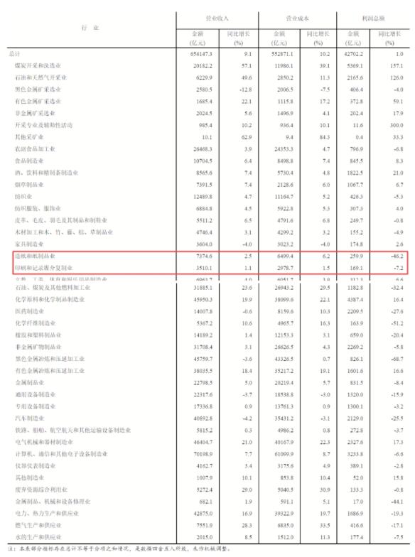 在41個工業大類行業中,16個行業利潤總額同比增長,24個行業下降,1個行業由虧轉盈。其中,造紙和紙制品業實現利潤總額259.9億元,同比下降46.2%;印刷和記錄媒介復制業實現利潤總額169.1億元,同比下降7.2%。 在收入方面,1-6月份,全國規模以上工業企業實現營業收入65.41萬億元,同比增長9.1%。其中,造紙和紙制品業實現營業收入7374.6億元,同比增長2.5%;印刷和記錄媒介復制業實現營業收入3510.1億元,同比增長1.1%。