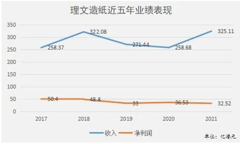 業績來看,2017-2021年,理文造紙實現營收258.37億港元、322.08億港元、271.44億港元、258.68億港元、325.11億港元,凈利潤50.4億港元、48.8億港元、33億港元、36.53億港元、32.52億港元。
