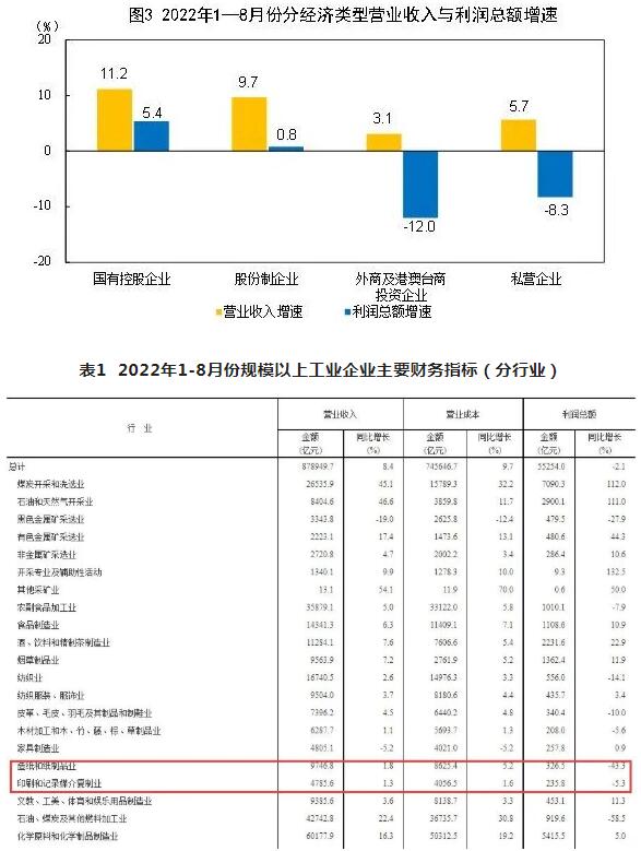 近日,國家統計局網站發布2022年1-8月份全國規模以上工業企業利潤。同期,國家統計局工業司高級統計師朱虹就數據情況進行了解讀。 數據顯示,1—8月份,全國規模以上工業企業實現利潤總額5.53萬億元,同比下降2.1%。 1—8月份,在41個工業大類行業中,16個行業利潤總額同比增長,25個行業下降。 值得關注的是,造紙和紙制品業實現營業收入9746.8億元,同比增長1.8%;利潤總額326.5億元,同比下降43.3%。印刷和記錄媒介復制業實現營業收入4785.6億元,同比增長1.3%;利潤總額235.8億元,同比下降5.3%。 1—8月份,規模以上工業企業實現營業收入87.89萬億元,同比增長8.4%;發生營業成本74.56萬億元,增長9.7%;營業收入利潤率為6.29%,同比下降0.67個百分點。 8月末,規模以上工業企業資產總計150.99萬億元,同比增長9.6%;負債合計85.76萬億元,增長10.0%;所有者權益合計65.23萬億元,增長9.2%;資產負債率為56.8%,同比提高0.2個百分點。 1—8月份,規模以上工業企業每百元營業收入中的成本為84.83元,同比增加1.04元;每百元營業收入中的費用為7.91元,同比減少0.51元。 8月末,規模以上工業企業每百元資產實現的營業收入為89.9元,同比減少1.4元;人均營業收入為176.2萬元,同比增加15.3萬元;產成品存貨周轉天數為18.3天,同比增加0.8天;應收賬款平均回收期為54.4天,同比增加2.9天。