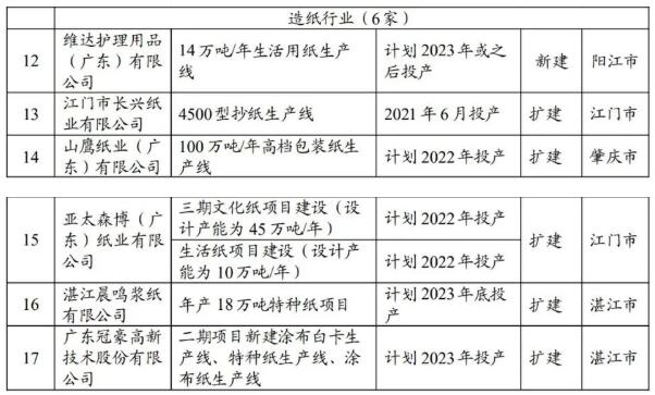 上述5個行業中已列入新建項目規劃,并于 2021-2023 年建成投產且預計年排放1 萬噸二氧化碳(或年綜合能源消費量 5000 噸標準煤)及以上的新建(含擴建、改建)項目企業,共 17 家,造紙企業共6家。