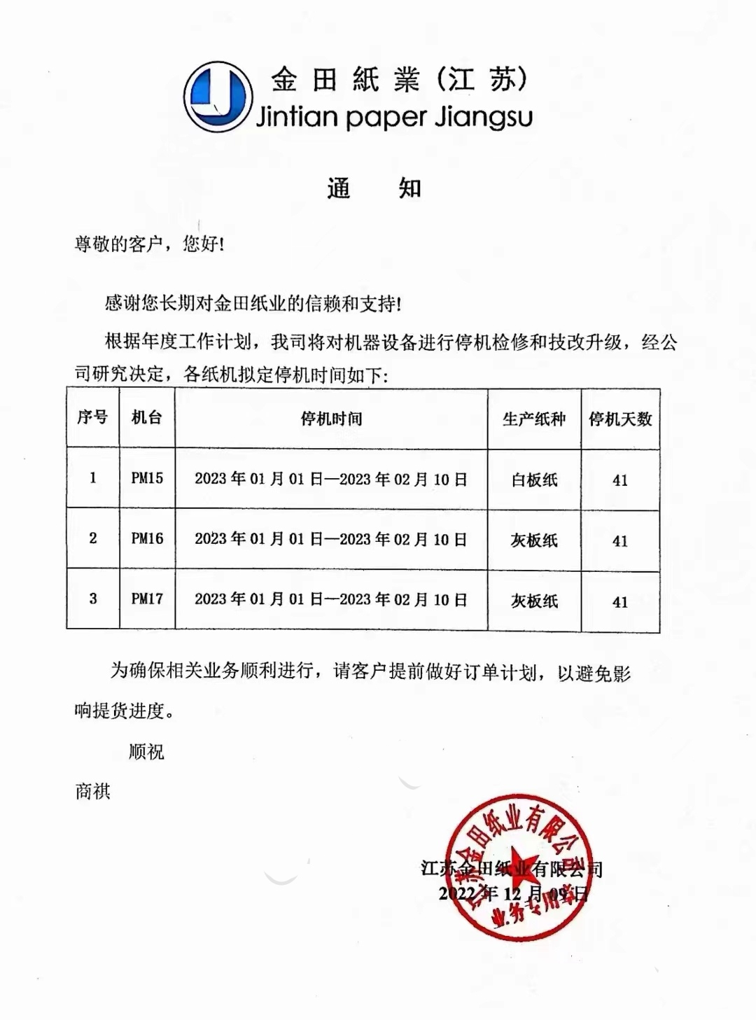 東莞市金田紙業有限公司成立于2003年,是一家現代化工業用紙造紙集團。公司位于東莞市萬江區大汾工業區,現有員工近2000人,主要生產灰板紙、瓦楞紙、紗管紙和涂布白板紙等產品。 此前,東莞市金田紙業還發布了停機通知,其PM1、PM2、PM3、PM5、PM6、PM7、PM8共七臺灰板紙機,以及牛卡紙機PM13均將在2023年1月1日-2023年2月10日停機41天。