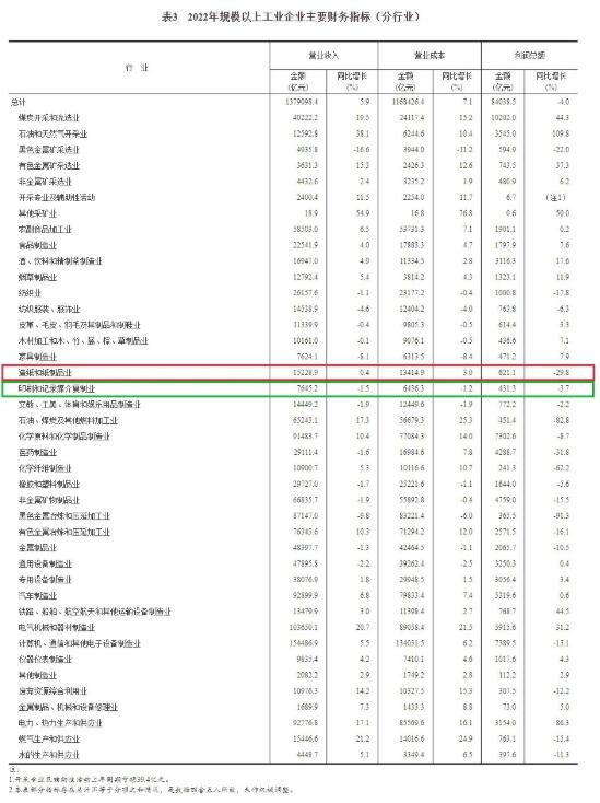 2022年,在41個工業(yè)大類行業(yè)中,21個行業(yè)利潤總額比上年增長,19個行業(yè)下降,1個行業(yè)由虧轉(zhuǎn)盈。其中,造紙和紙制品業(yè)利潤總額621.1億元,同比下降29.8%。印刷和記錄媒介復(fù)制業(yè)利潤總額431.3億元,同比下降3.7%。 在營業(yè)收入方面,2022年,全國規(guī)模以上工業(yè)企業(yè)實現(xiàn)營業(yè)收入137.91萬億元,比上年增長5.9%。其中,造紙和紙制品業(yè)實現(xiàn)營業(yè)收入15228.9億元,同比增長0.4%;印刷和記錄媒介復(fù)制業(yè)實現(xiàn)營業(yè)收入7645.2億元,同比下降1.5%。