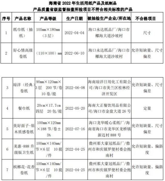 不合格產品涉及抽樣自海口永達紙品廠的1批次紙巾紙(抽紙)、1批次好心情高級卷紙;抽樣自海南瓊洋日用化工有限公司的1批次瓊洋(經典)卷紙;抽樣自海南大正餐飲用品有限公司的1批次餐巾紙等。不合格項目為:衛生紙的“尺寸偏差”、“偏斜度”、“允許短缺量”和紙巾紙的“尺寸”、“定量”。