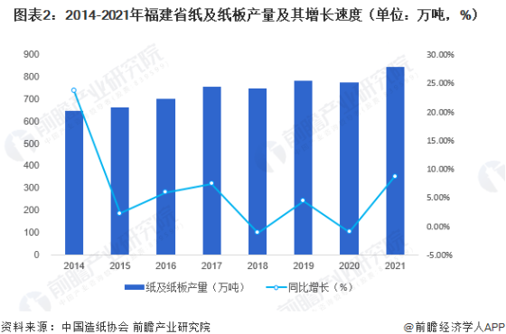 福建省紙制品包裝政策發展環境 2021年7月,福建省發布《福建省“十四五”制造業高質量發展專項規劃》,規劃中明確突出特色化、流派化發展,著力推動福建傳統工藝振興,提升工藝美術、家裝日用品、造紙及紙制品等。到2025年,全省特色輕工產業規模達到5500億元。以泉州、漳州為重點,打造紙及紙制品產業集群,引導恒安、玖龍、聯盛、青山紙業等企業加強自主創新能力建設,提升設計集成能力和生產工藝技術裝備水平。重點提高生活用紙、包裝用紙及紙板、特種紙及紙板的產品質量,優化品種結構,研發制漿造紙纖維資源綜合利用和循環利用技術,推動資源能源高效合理利用。 2021年福建省紙及紙板產量為845萬噸 根據中國造紙協會統計數據顯示,2014年以來,福建省紙及紙板產量穩居全國前列。2014-2020年,福建省紙及紙板產量總體呈現波動增長變化趨勢。2021年,全省紙及紙板產量為845萬噸,相比上年增加8.75%。2021年福建省紙及紙板產量占全國紙及紙板總產量的比重為7.28%,排名第五。