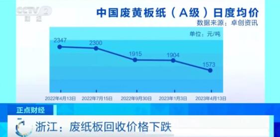 數據顯示,截至4月13日,國內A級廢黃板紙報價每噸1573元,較去年同期水平每噸2347元,跌幅超30%,是近五年來的最低位。業內人士表示,廢紙板的定價往往取決于下游的造紙廠。在成品紙行情好的時候,廢紙回收價格也會隨之上行;然而去年成品紙的終端需求較弱,導致造紙廠庫存高企,生產需求下降,因此調低了廢紙的采購價格和回收總量。 上海:造紙企業加速去庫存 二季度業績有望迎來修復 記者在采訪中了解到,使用廢紙作為原料的一般是生產箱板瓦楞紙等工業包裝用紙的企業。廢紙價格下行很大一部分原因是這類造紙企業為了調節利潤做出的舉措。目前紙企的經營情況怎么樣?廢紙價格下跌,對于紙企的盈利能力是否有改善? 在箱板瓦楞紙的生產中,廢紙的成本占比高達70%。業內人士表示,正常來講紙企的凈利潤在每噸300到400元左右,而從去年開始,因為木漿、廢紙等原材料價格大漲和終端需求低迷,紙企已經面臨虧損。根據部分上市公司紙企發布的業績預告來看,歸母凈利潤普遍大幅下滑。 上海某紙業股份有限公司副總裁 嚴大林:成品紙的價格往下跌(每噸)300元左右,之前我可能可以賣大概4500元一噸的價格,現在目前只能4200元以下去賣。為了企業能夠保證一定的現金利潤,我不得不把廢紙的采購價格壓低。 今年一季度以來,造紙原材料木漿的價格出現松動。4月13日針葉漿報價每噸5953元,相比去年同期每噸7040元,同比下跌15.4%,并且周環比跌幅仍在擴大。可以看出造紙產業成本端壓力正在緩解。