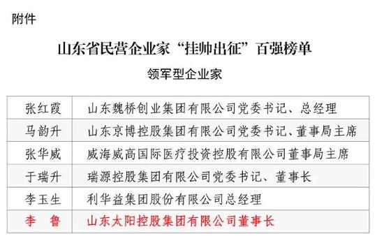 4月20日,山東省委、省政府在濟(jì)南召開全省民營(yíng)經(jīng)濟(jì)高質(zhì)量發(fā)展工作會(huì)議,會(huì)上發(fā)布了山東省民營(yíng)企業(yè)家“掛帥出征”百?gòu)?qiáng)榜單,包括30名領(lǐng)軍型企業(yè)家、40名菁英型企業(yè)家及30名新星型企業(yè)家。公司控股股東山東太陽(yáng)控股集團(tuán)有限公司董事長(zhǎng)李魯榮獲山東省民營(yíng)企業(yè)家“掛帥出征”百?gòu)?qiáng)榜領(lǐng)軍企業(yè)家稱號(hào)。