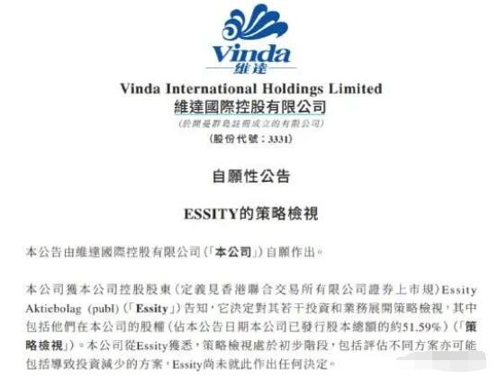 近日,維達(dá)國際(03331.HK)的控股股東瑞典Essity AB(愛適瑞)公布,正考慮出售維達(dá)大部分股份,據(jù)稱Essity正在討論出售部分或手上全部51.59%的維達(dá)股權(quán)。 Essity于4月26日宣布為達(dá)至長期價值創(chuàng)造,正啟動策略性檢討手上的維達(dá)持股及歐洲的私人品牌消費性紙巾業(yè)務(wù),藉此尋求不同選擇,結(jié)果可能導(dǎo)致出售有關(guān)項目,但目前未有最終決定。公司是次檢討,旨在減低消費類紙巾業(yè)務(wù)占比。
