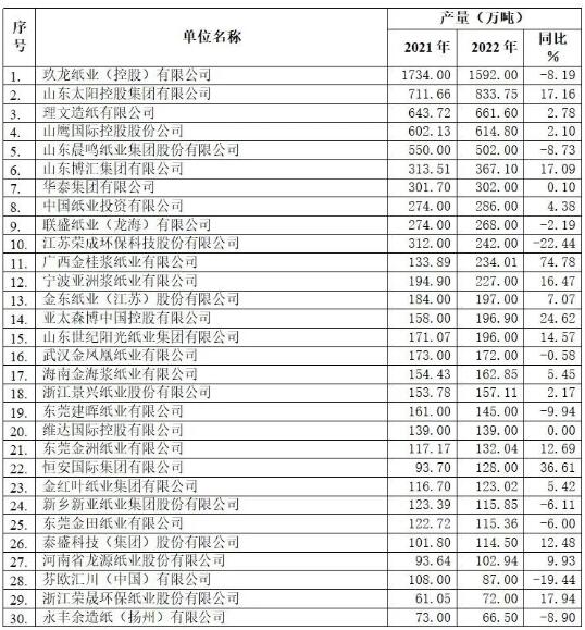 (2022年重點造紙企業產量前30名企業) 從已收到的數據來看,2022年箱紙板主要生產企業共有13家: