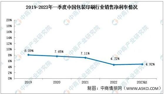 包裝印刷行業銷售凈利率整體呈現緩慢下降趨勢,2019年包裝印刷行業銷售凈利率8.09%,2021年銷售凈利率7.11%,2023年一季度,包裝印刷4.92%。