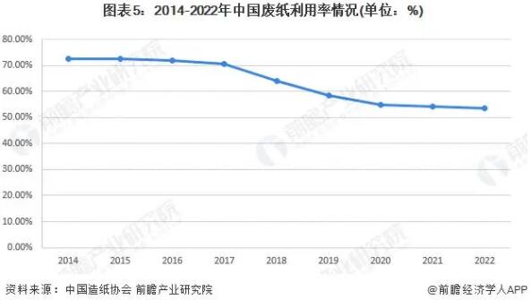 ——廢紙利用利用率下滑明顯 近年來,我國廢紙回收量不斷增長,相比較而言,廢紙消費量小于回收量,這導致我國廢紙利用率下滑明顯。2014-2017年,我國廢紙利用率均高于70%,到2022年,我國廢紙利用率已跌至53.5%。