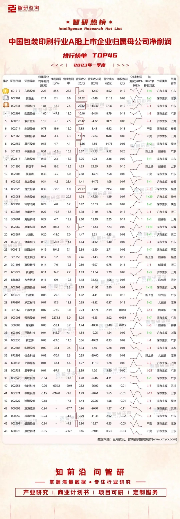 46家包裝印刷A股上市企業2023年第一季度總計歸屬母公司凈利潤為14.88億元,同比增長0.53%(截至2022年5月15日,2022Q1共有41家包裝印刷上市企業公布數據,總計歸屬母公司凈利潤為14.8億元),總計營收275.4億元。