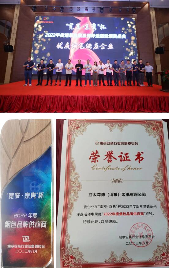 8月13日,2023年煙草包裝最新發展趨勢研討會暨2022年度煙草包裝系列評選活動慶典在成都市舉行。亞太森博榮獲“2022年度煙包品牌供應商”稱號。 “中國十大煙標”及煙草包裝系列評選活動自2006年開始舉辦,是中國煙草包裝領域最具規模和影響力的年度盛會,是業內企業品牌形象和綜合實力的展示平臺。獎項評選采用專家評審、現場評選、公開投票等方式進行,從新材料、新工藝、新技術應用等多方面考量,圍繞品牌文化、環保性、美觀性、經濟性、防偽性、個性化等開展綜合性評比。