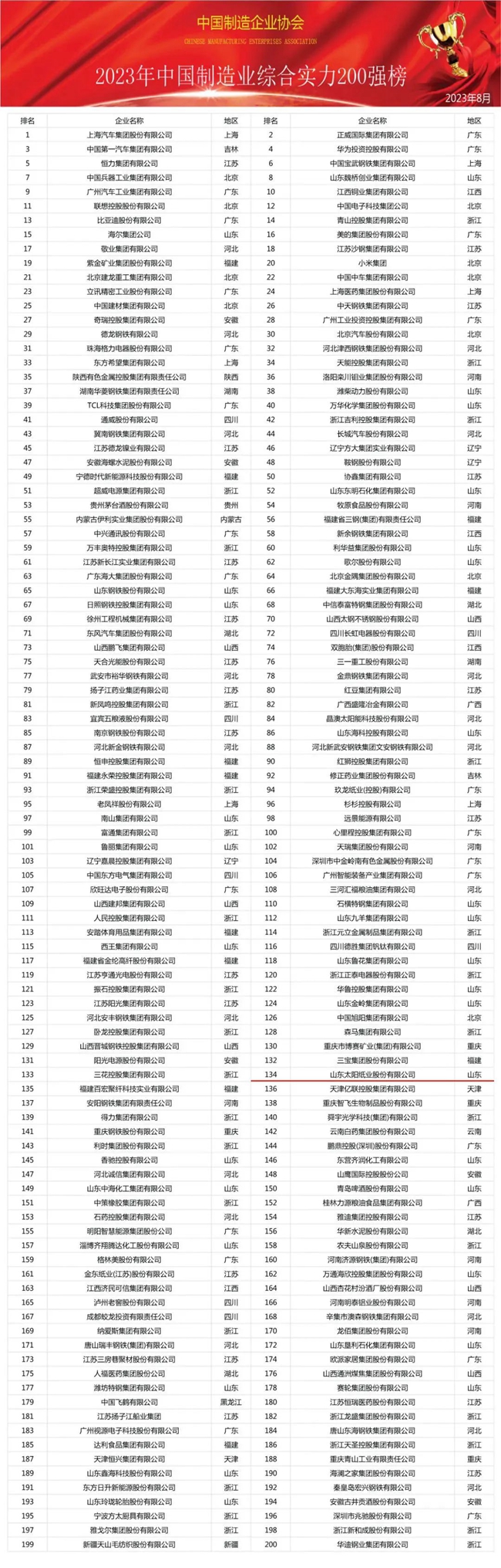 近日,2023年中國制造業綜合實力200強暨中國裝備制造業100強排行榜發布,太陽紙業榮登榜單,位列第134位。