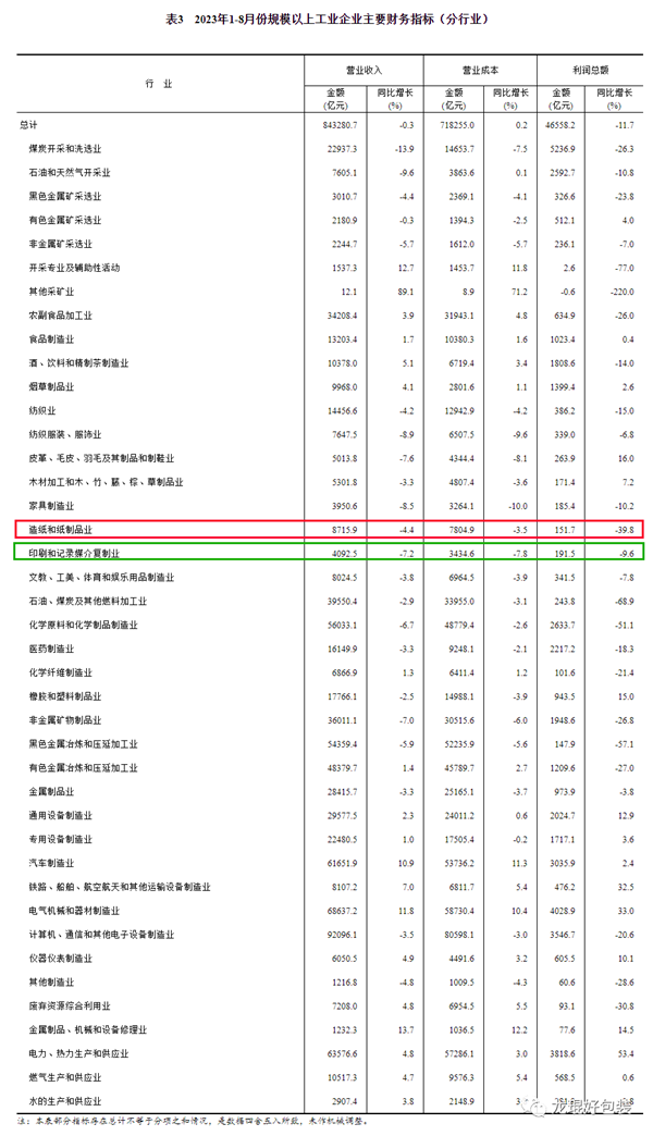 在41個工業大類行業中,造紙和紙制品業在1-8月份實現利潤總額151.7億元,同比下降39.8%;印刷和記錄媒介復制業在1-8月份實現利潤總額191.5億元,同比下降9.6%。利潤降幅較1-7月份均有所收窄。 在營業收入方面,1-8月份,規模以上工業企業實現營業收入84.33萬億元,同比下降0.3%。其中,造紙和紙制品業實現營業收入8715.9億元,同比下降4.4%;印刷和記錄媒介復制業實現營業收入4092.5億元,同比下降7.2%。