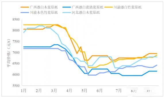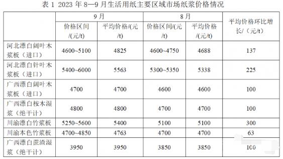 圖2 2023年1—9月川渝竹漿和廣西漂白蔗渣漿平均價格變化趨勢 從各類紙漿價格變化曲線,以及國內市場目前紙漿的供應情況來分析,木漿和非木漿價格變化存在一定的相關性。非木漿價格一定程度上受到木漿價格變化的影響,當木漿價格上漲時,非木漿也呈現不同程度的上漲,但值得注意的是,本色竹漿由于需求減少,2023年以來至今價格一直相對較為穩定。 2023年9月,河北漂白闊葉木漿板(進口)平均價格4825/t、河北漂白針葉木漿板(進口)平均價格5563/t、廣西漂白闊葉木漿板(進口)平均價格4700/t、廣西本地漂白桉木濕漿(絕干計)平均價格約4800/t,較2023年8月均有所上漲。 非木漿中,川渝漂白竹漿平均價格約5400/t,較2023年8月(5100/t)上漲300/t;本色竹漿平均價格約4763/t,較2023年8月(4700/t)略有上漲。廣西漂白蔗渣濕漿(絕干計)平均價格約3950/t,較2023年8月(3850/t)上漲100/t。具體變化情況見表1。 紙漿價格的波動也對生活用紙原紙的價格產生一定影響,原紙價格總體的變化趨勢與紙漿保持一致,但原紙價格的漲幅與紙漿價格漲幅并不完全一致,時間點也不完全同步,主要原因是國內原紙產能相對過剩,市場競爭激烈,原紙價格變化相對紙漿價格變化有一定的滯后。 同時具體影響程度還取決于多種因素,如企業產品定位、新產品開發、產品升級等。