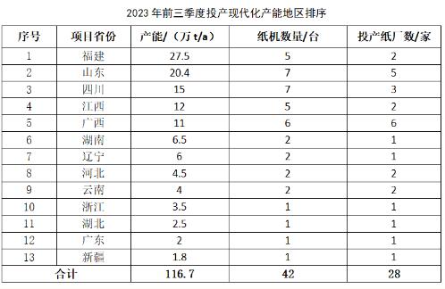 根據生活用紙委員會秘書處調研匯總,2023年1—9月,行業新投產現代化產能約116.7萬t/a,共42臺紙機,包括國產紙機30臺,進口紙機12臺。其中,第一季度投產30.9萬t/a,第二季度投產50.1萬t/a,第三季度投產35.7萬t/a,與2022年1—9月投產產能131.2萬t/a相比,產能增幅有所回落。