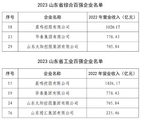10月11日,山東省工業和信息化廳公示了2023山東省綜合百強企業名單、工業百強企業名單。晨鳴控股有限公司、華泰集團有限公司和山東太陽控股集團有限公司分別位列“2023山東省綜合百強企業”第18位、第23位和第29位。同時,3家企業和山東博匯集團有限公司上榜“2023山東省工業百強企業”,分別位列第15位、第19位、第24位和第76位。