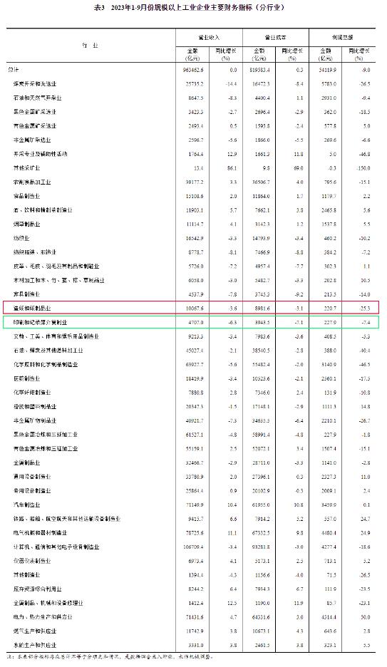 值得關注的是,造紙和紙制品業(yè)實現(xiàn)利潤總額220.7億元,同比下降25.3%;印刷和記錄媒介復制業(yè)實現(xiàn)利潤總額227.9億元,同比下降7.4%。 1—9月份,規(guī)模以上工業(yè)企業(yè)實現(xiàn)營業(yè)收入96.35萬億元,同比持平;發(fā)生營業(yè)成本81.96萬億元,增長0.3%;營業(yè)收入利潤率為5.62%,同比下降0.55個百分點。其中,造紙和紙制品業(yè)實現(xiàn)營業(yè)收入10067.6億元,同比下降3.6%;印刷和記錄媒介復制業(yè)實現(xiàn)營業(yè)收入4707.0億元,同比下降6.3%。 9月末,規(guī)模以上工業(yè)企業(yè)資產總計164.40萬億元,同比增長6.4%;負債合計94.63萬億元,增長6.7%;所有者權益合計69.77萬億元,增長6.0%;資產負債率為57.6%,同比上升0.2個百分點。 9月末,規(guī)模以上工業(yè)企業(yè)應收賬款23.75萬億元,同比增長9.7%;產成品存貨6.13萬億元,增長3.1%。 1—9月份,規(guī)模以上工業(yè)企業(yè)每百元營業(yè)收入中的成本為85.07元,同比增加0.30元;每百元營業(yè)收入中的費用為8.34元,同比增加0.28元。 9月末,規(guī)模以上工業(yè)企業(yè)每百元資產實現(xiàn)的營業(yè)收入為80.1元,同比減少5.8元;人均營業(yè)收入為177.4萬元,同比增加6.0萬元;產成品存貨周轉天數(shù)為20.0天,同比增加1.2天;應收賬款平均回收期為63.0天,同比增加5.9天。 9月份,規(guī)模以上工業(yè)企業(yè)實現(xiàn)利潤同比增長11.9%。 國家統(tǒng)計局工業(yè)司統(tǒng)計師于衛(wèi)寧解讀工業(yè)企業(yè)利潤數(shù)據(jù)表示,前三季度,隨著宏觀政策“組合拳”效果不斷顯現(xiàn),市場需求持續(xù)改善,工業(yè)生產平穩(wěn)增長,工業(yè)企業(yè)營收利潤持續(xù)恢復向好,企業(yè)效益狀況呈現(xiàn)以下主要特點:工業(yè)企業(yè)利潤逐季回升,當季利潤由降轉增。企業(yè)當季營收由降轉增,帶動利潤加快改善。三大門類利潤均有改善,六成行業(yè)利潤好轉。原材料制造業(yè)利潤降幅顯著收窄。消費品制造業(yè)利潤明顯好轉。不同類型企業(yè)利潤均有回升。企業(yè)單位成本下降,營業(yè)收入利潤率提高。總體看,前三季度工業(yè)企業(yè)利潤逐季改善,恢復向好態(tài)勢明顯。