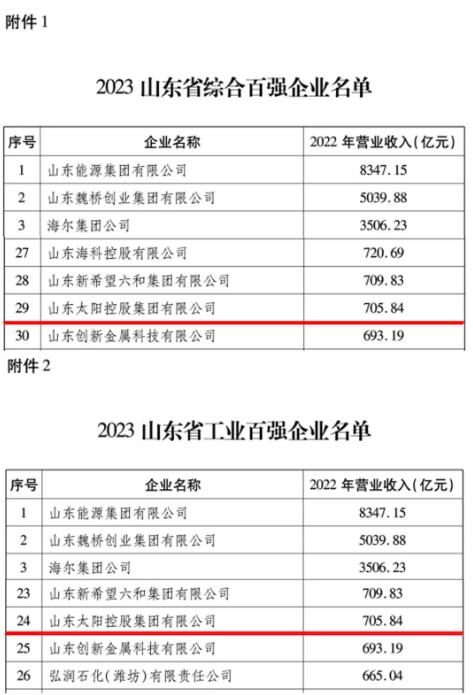 近日,省工業(yè)和信息化廳、省企業(yè)聯(lián)合會(huì)公布2023年山東省百強(qiáng)企業(yè)名單,公司控股股東山東太陽控股集團(tuán)有限公司再次榮登榜單,位列2023山東省綜合百強(qiáng)企業(yè)第29位,2023山東工業(yè)百強(qiáng)企業(yè)第24位,彰顯了企業(yè)綠色低碳高質(zhì)量發(fā)展的強(qiáng)勁實(shí)力。