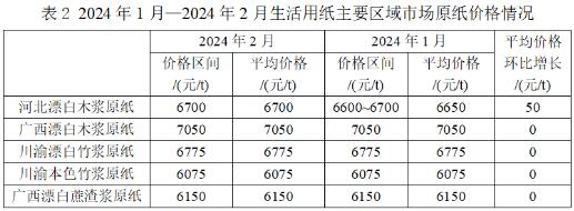 據(jù)《生活用紙》雜志調(diào)研數(shù)據(jù),2024年2月各類(lèi)紙漿原料平均價(jià)格相較2024年1月,雖然有所波動(dòng),但變化幅度較小,總體價(jià)格相對(duì)穩(wěn)定。2月上旬和中旬,紙漿價(jià)格整體處于穩(wěn)定狀態(tài),春節(jié)返工后,河北地區(qū)進(jìn)口木漿平均價(jià)格有所上漲,廣西地區(qū)各類(lèi)紙漿平均價(jià)格有所下降。