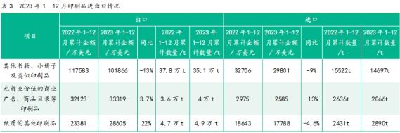 (1)版材 1)PS版 2023年1—12月,出口PS版3420萬(wàn)m2,金額1億美元,金額同比下降25%。其中,出口韓國(guó)數(shù)量最大,960萬(wàn)m2,金額也最高,為2579萬(wàn)美元。出口金額其次為孟加拉國(guó)、印度和土耳其。 2022年同期出口4590萬(wàn)m2,金額1.4億美元。 與出口相比,PS版進(jìn)口數(shù)量和金額均較少。 2)CTP版 2023年1—12月,出口CTP版1.86億m2,金額5.8億美元。其中出口荷蘭金額最高,8411萬(wàn)美元,2000萬(wàn)m2;其次為韓國(guó),2032萬(wàn)m2,金額5965萬(wàn)美元;印度1279萬(wàn)m2,3868萬(wàn)美元;土耳其957萬(wàn)m2,2838萬(wàn)美元。 相對(duì)于CTP版出口,CTP版的進(jìn)口數(shù)量和金額都較少。 3)柔性印刷版 2023年1—12月,進(jìn)口柔性印刷版62.9萬(wàn)m2,金額3178萬(wàn)美元。進(jìn)口柔版主要來(lái)自發(fā)達(dá)國(guó)家。進(jìn)口數(shù)量最多的來(lái)源國(guó)是德國(guó)和日本,兩國(guó)進(jìn)口數(shù)量相加為45.6萬(wàn)m2,占總進(jìn)口數(shù)量的73%。 2023年1—12月,出口柔性印刷版65.6萬(wàn)m2,金額2390萬(wàn)美元。從數(shù)量和金額來(lái)看,第一大出口目的國(guó)是俄羅斯,16萬(wàn)m2,金額549萬(wàn)美元;其次為越南、印度、比利時(shí)和印度尼西亞。 (2)油墨 1)黑色印刷油墨 2023年1—12月,進(jìn)口黑色油墨1633t,金額5157萬(wàn)美元。其中,從日本進(jìn)口數(shù)量最多,為621t,金額2141萬(wàn)美元,數(shù)量約占總進(jìn)口量的38%;其次為英國(guó)、新加坡、韓國(guó)、德國(guó)、法國(guó)和美國(guó)。 2023年1—12月,出口黑色油墨3731t,金額1747萬(wàn)美元。其中,出俄羅斯最多,412t,金額279萬(wàn)美元;其次是印度尼西亞,393t,金額178萬(wàn)美元。 2)其他印刷油墨 2023年1—12月,進(jìn)口其他印刷油墨6377t,金額2.1億美元。進(jìn)口數(shù)量最大的來(lái)源國(guó)為日本,1610t,占總進(jìn)口數(shù)量的1/4,金額7290萬(wàn)美元,占總進(jìn)口金額的1/3。從瑞士進(jìn)口了119t,金額3111萬(wàn)美元,金額排名第二。從韓國(guó)進(jìn)口943t,2314萬(wàn)美元,金額排名第三。 2023年1—12月進(jìn)口數(shù)量同比減少了775t,金額卻增加了748萬(wàn)美元。 2023年1—12月,出口其他印刷油墨3.2萬(wàn)t,1.5億美元其中,從金額上看出口俄羅斯最多,1920萬(wàn)美元,2246t;其次為越南,1627萬(wàn)美元,4131t;印度尼西亞1185萬(wàn)美元,2738t。 (3)水性噴墨墨水 2023年1—12月,出口水性噴墨墨水3.7萬(wàn)t,金額2.6億美元,金額同比增長(zhǎng)9%。出口金額最大的市場(chǎng)是印度,6222t,3092萬(wàn)美元;巴基斯坦第二,4393t,2426萬(wàn)美元;排名第三的是印度尼西亞,2247t,1735萬(wàn)美元;美國(guó)第四,1146t,1459萬(wàn)美元;泰國(guó)第五,1650t,1436萬(wàn)美元。 2023年1—12月,進(jìn)口水性噴墨墨水5400t,金額1.3億美元。其中,從馬來(lái)西亞進(jìn)口最多,1815t,6336萬(wàn)美元,占總進(jìn)口金額的一半;其次是日本,1398t,2971萬(wàn)美元。 3.印刷品 2023年1—12月印刷品進(jìn)出口數(shù)據(jù)如表3所示。