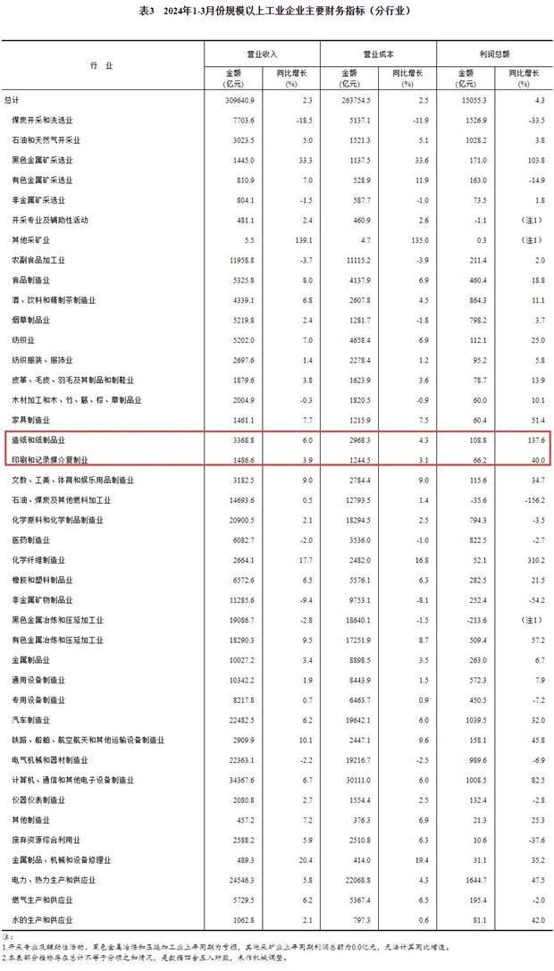 值得關注的是,1—3月份造紙和紙制品業實現營業收入3368.8億元,同比增長6.0%;實現利潤總額108.8億元,同比增長137.6%。