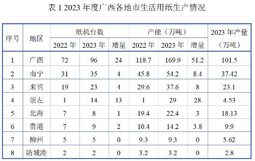 近年來,廣西有關(guān)政府部門對(duì)造紙產(chǎn)業(yè)的發(fā)展予以高度關(guān)注和重點(diǎn)推進(jìn),廣西日漸發(fā)展成為中國制漿造紙的熱土之一。據(jù)統(tǒng)計(jì),廣西已批、在建的制漿造紙項(xiàng)目以及建成投產(chǎn)的項(xiàng)目中,漿和紙總產(chǎn)能已突破四千萬噸,這將進(jìn)一步推動(dòng)廣西成為全國造紙行業(yè)的重要生產(chǎn)基地。生活用紙作為廣西造紙行業(yè)生產(chǎn)的主要紙種之一,產(chǎn)量逐年增加,2023年全國新增生活用紙產(chǎn)能175萬噸,廣西新增產(chǎn)能占比約為30%,產(chǎn)能增加量位居全國第一,遙遙領(lǐng)先于其他省份。 一、行業(yè)發(fā)展概況 (一)產(chǎn)能和產(chǎn)量創(chuàng)歷史新高 2023年底,廣西生活用紙中高速紙機(jī)總產(chǎn)能為169.9萬噸,比上年增加51.2萬噸,同比增長43.1%。廣西生活用紙實(shí)際生產(chǎn)總量為107萬噸,比上年增加14萬噸,同比增長18.3%,其中,中高速紙機(jī)的產(chǎn)量為101.5萬噸。 2023年,廣西生活用紙中高速紙機(jī)產(chǎn)能分布在南寧等七個(gè)市(縣),其中南寧地區(qū)產(chǎn)能為54.2萬噸,產(chǎn)量為37.42萬噸,均居廣西第一。廣西各地市生活用紙生產(chǎn)情況詳見表1。