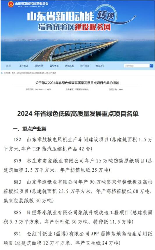 山東省綠色低碳高質(zhì)量發(fā)展重點(diǎn)項(xiàng)目 2024年1月11日,山東省發(fā)展和改革委員會(huì)發(fā)布《關(guān)于印發(fā)2024年省綠色低碳高質(zhì)量發(fā)展重點(diǎn)項(xiàng)目名單的通知》(魯發(fā)改動(dòng)能辦〔2024〕7號(hào)),確定2024年度山東省綠色低碳高質(zhì)量發(fā)展重點(diǎn)項(xiàng)目1400項(xiàng)。其中棗莊市海象紙業(yè)有限公司年產(chǎn)25萬噸紡?fù)苍堩?xiàng)目、山東華邁紙業(yè)有限公司年產(chǎn)90萬噸集束包裝紙板及高檔箱板紙項(xiàng)目、日照華泰紙業(yè)有限公司漿紙升級(jí)改造工程項(xiàng)目、金紅葉紙業(yè)(淄博)有限公司APP淄博基地高檔生活用紙項(xiàng)目和山東章鼓核電風(fēng)機(jī)生產(chǎn)車間建設(shè)項(xiàng)目入選。