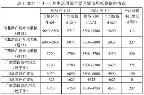 據(jù)《生活用紙》雜志調(diào)研數(shù)據(jù),2024年4月生活用紙主要區(qū)域市場紙漿價格,除川渝地區(qū)本色竹漿板價格保持不變外,其他各類紙漿價格均有上漲,且漲幅均超過了150元/t。其中漲幅最大的為河北漂白闊葉木漿板(進(jìn)口),4月份平均價格相較3月上漲313元/t。 2024年4月紙漿價格變化情況具體如下,河北漂白闊葉木漿板(進(jìn)口)平均價格上漲313元/t,為5713元/t。河北漂白針葉木漿板(進(jìn)口)平均價格上漲237元/t,為6075元/t。廣西漂白闊葉木漿板(進(jìn)口)平均價格上漲250元/t,為5700元/t。廣西本地漂白桉木濕漿(絕干計)平均價格上漲275元/t,為5700元/t。 非木漿原料中,川渝漂白竹漿平均價格上漲150元/t,為6050元/t,川渝本色竹漿平均價格約4625元/t,與2024年3月持平。廣西漂白蔗渣濕漿(絕干計)平均價格上漲237元/t,為4750元/t。 具體變化情況見表1。