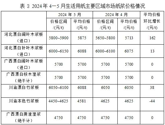 2024年5月,河北漂白闊葉木漿板(進(jìn)口)平均價格上漲,且漲幅達(dá)到162元/t。廣西地區(qū)各類紙漿5月平均價格保持相對穩(wěn)定。川渝地區(qū)漂白竹漿板價格略有上漲,本色竹漿板價格略有下降。 2024年5月紙漿價格變化情況具體如下,河北漂白闊葉木漿板(進(jìn)口)平均價格上漲162元/t,為5875元/t。河北漂白針葉木漿板(進(jìn)口)平均價格上漲13元/t,為6088元/t。廣西漂白闊葉木漿板(進(jìn)口)平均價格為5700元/t。廣西本地漂白桉木濕漿(絕干計)平均價格為5700元/t,均與4月持平。 非木漿原料中,川渝漂白竹漿平均價格上漲38元/t,為6088元/t,川渝本色竹漿平均價格下降44元/t,約4581元/t。廣西漂白蔗渣濕漿(絕干計)平均價格4750元/t,與4月持平。 具體變化情況見表3。