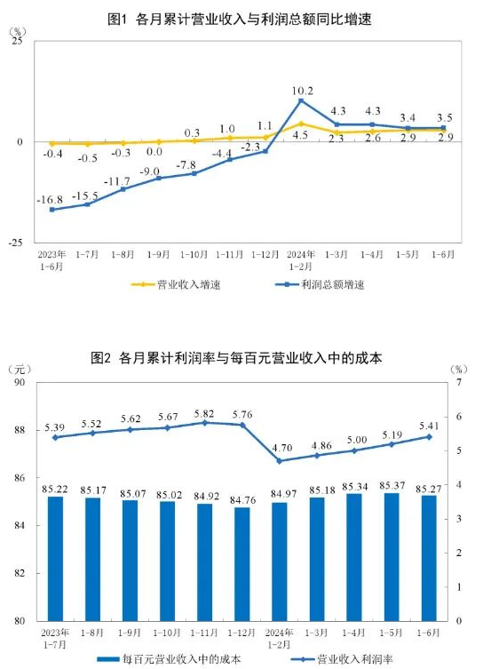 1—6月份,規(guī)模以上工業(yè)企業(yè)實(shí)現(xiàn)營業(yè)收入64.86萬億元,同比增長2.9%;發(fā)生營業(yè)成本55.31萬億元,增長2.9%;營業(yè)收入利潤率為5.41%,同比提高0.03個(gè)百分點(diǎn)。其中,造紙和紙制品業(yè)實(shí)現(xiàn)營業(yè)收入6992.1億元,同比增長6.0%;印刷和記錄媒介復(fù)制業(yè)實(shí)現(xiàn)營業(yè)收入3118.2億元,同比增長3.5%。 6月末,規(guī)模以上工業(yè)企業(yè)資產(chǎn)總計(jì)172.05萬億元,同比增長5.7%;負(fù)債合計(jì)99.07萬億元,增長5.4%;所有者權(quán)益合計(jì)72.97萬億元,增長6.0%;資產(chǎn)負(fù)債率為57.6%,同比下降0.1個(gè)百分點(diǎn)。 6月末,規(guī)模以上工業(yè)企業(yè)應(yīng)收賬款24.75萬億元,同比增長8.6%;產(chǎn)成品存貨6.37萬億元,增長4.7%。 1—6月份,規(guī)模以上工業(yè)企業(yè)每百元營業(yè)收入中的成本為85.27元,同比增加0.02元;每百元營業(yè)收入中的費(fèi)用為8.43元,同比增加0.05元。 6月末,規(guī)模以上工業(yè)企業(yè)每百元資產(chǎn)實(shí)現(xiàn)的營業(yè)收入為76.3元,同比減少2.4元;人均營業(yè)收入為178.8萬元,同比增加7.5萬元;產(chǎn)成品存貨周轉(zhuǎn)天數(shù)為20.3天,同比增加0.2天;應(yīng)收賬款平均回收期為66.2天,同比增加3.5天。 6月份,規(guī)模以上工業(yè)企業(yè)實(shí)現(xiàn)利潤同比增長3.6%。 國家統(tǒng)計(jì)局工業(yè)司統(tǒng)計(jì)師于衛(wèi)寧解讀工業(yè)企業(yè)利潤數(shù)據(jù)表示,上半年,隨著各項(xiàng)宏觀政策落實(shí)落細(xì),工業(yè)生產(chǎn)平穩(wěn)較快增長,企業(yè)利潤持續(xù)穩(wěn)定恢復(fù),工業(yè)企業(yè)效益狀況呈現(xiàn)以下主要特點(diǎn):工業(yè)企業(yè)利潤增速有所加快。工業(yè)企業(yè)營收穩(wěn)定恢復(fù)。裝備制造業(yè)有力支撐工業(yè)利潤增長。消費(fèi)品制造業(yè)利潤持續(xù)快速增長。采礦業(yè)、原材料制造業(yè)利潤降幅明顯收窄。企業(yè)當(dāng)月單位成本繼續(xù)同比減少。總體看,上半年規(guī)上工業(yè)企業(yè)效益平穩(wěn)恢復(fù),同時(shí)也要看到,國內(nèi)有效需求不足制約企業(yè)效益持續(xù)改善,國際環(huán)境嚴(yán)峻復(fù)雜加大企業(yè)經(jīng)營壓力,工業(yè)企業(yè)效益恢復(fù)基礎(chǔ)仍需鞏固。