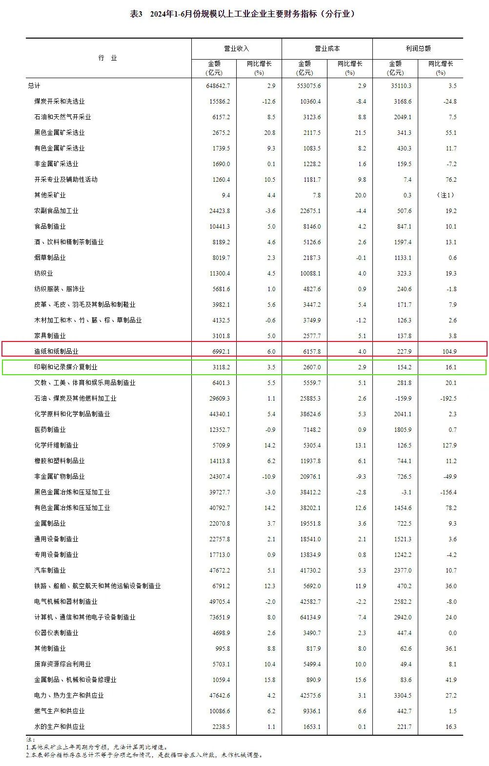 1—6月份,主要行業(yè)利潤情況如下:有色金屬冶煉和壓延加工業(yè)利潤同比增長78.2%,電力、熱力生產(chǎn)和供應(yīng)業(yè)增長27.2%,計(jì)算機(jī)、通信和其他電子設(shè)備制造業(yè)增長24.0%,紡織業(yè)增長19.3%,農(nóng)副食品加工業(yè)增長19.2%,汽車制造業(yè)增長10.7%,石油和天然氣開采業(yè)增長7.5%,通用設(shè)備制造業(yè)增長3.6%,化學(xué)原料和化學(xué)制品制造業(yè)增長2.3%,專用設(shè)備制造業(yè)下降4.2%,電氣機(jī)械和器材制造業(yè)下降8.0%,煤炭開采和洗選業(yè)下降24.8%,非金屬礦物制品業(yè)下降49.9%,石油煤炭及其他燃料加工業(yè)、黑色金屬冶煉和壓延加工業(yè)同比由盈轉(zhuǎn)虧。 值得關(guān)注的是,造紙和紙制品業(yè)實(shí)現(xiàn)利潤總額227.9億元,同比增長104.9%;印刷和記錄媒介復(fù)制業(yè)實(shí)現(xiàn)利潤總額154.2億元,同比增長16.1%。