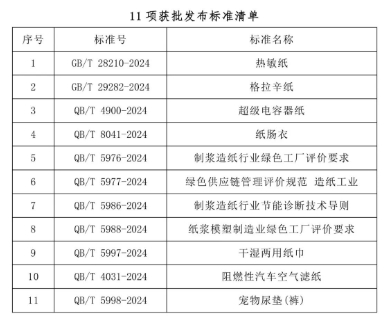 近年來,全國造紙工業標準化技術委員會(以下簡稱“造紙標委會”)始終聚焦“消費品安全、產品質量提升、綠色制造”等核心領域開展標準研制,先后完成了《紙巾》《紙尿褲第1部分:嬰兒紙尿褲》《嬰幼兒及兒童用紙品基本安全技術規范》《綠色產品評價紙和紙制品》《再生紙漿》等多項重要標準,為提升產品質量和安全性、保障消費者權益、促進行業綠色、可持續發展發揮了重要引領作用。 2024年,造紙標委會繼續堅持以行業需求為導向,不斷深化和完善造紙工業標準體系,引領造紙行業綠色、高質量發展。截止目前,共有11項國家和行業標準獲批發布,19項國家和行業標準制修訂計劃批準下達。 11項標準獲批發布 11項發布標準中有兩項國家標準,9項行業標準。《制漿造紙行業綠色工廠評價要求》《綠色供應鏈管理評價規范造紙工業》《制漿造紙行業節能診斷技術導則》等4項綠色制造相關標準的發布,為造紙企業開展綠色工廠和綠色供應鏈評價、節能診斷提供了技術依據,有助于促進造紙行業節能減排,推動造紙行業綠色低碳發展。《熱敏紙》《超級電容器紙》《寵物尿墊(褲)》等7項產品標準的發布,對規范企業生產、引領產品質量提升和技術創新,助推造紙工業健康發展具有重要意義。