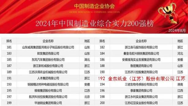 近日,中國制造企業協會對外發布《2024中國制造業綜合實力200強暨中國裝備制造業百強》榜單,金東紙業憑借出眾的創新能力和出色的業績表現,入圍2024中國制造業綜合實力200強榜單,位列192位。