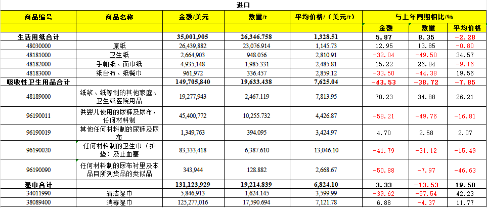 根據海關統計數據,2024年前三季度,中國生活用紙產品繼續呈現貿易順差走勢,并且出口量顯著增長。吸收性衛生用品及濕巾的進口量持續減少,出口業務保持增長。各類產品具體進出口情況分析如下: