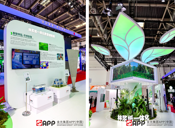 金光集團APP是“林漿紙一體化”發展模式的先驅者和倡導者,在進入中國市場之時就將這一理念引入中國,樹立了良好的典范,并形成了產業綠色轉型的帶動效應。此次鏈博會展臺,金光集團APP中國圍繞“林漿紙一體化”核心理念,精心打造綠色價值鏈與數智創新鏈兩大展示主線。