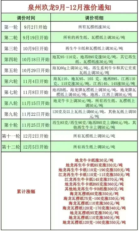 天津玖龍12月4日價格調整計劃: 玖龍?/地龍優質?/海龍b?/再生紙上調50元/噸。海龍?/地龍牛卡/江龍?/白面?/瓦紙上調30元/噸。灰底白/江龍B上調60元/噸,地龍/江龍上調30元/噸。 河北基地:所有再生紙上調50元/噸,地龍?/瓦紙上調30元/噸。 重慶玖龍12月3日價格調整計劃: 重慶基地:120克及以下瓦紙上調80元/噸,120克以上瓦紙漲50元/噸;105克及以下再生紙漲80元/噸,105克以上漲50元/噸;牛卡紙(除白面、涂布)漲30元/噸。 樂山基地:75克及以上漲80元/噸,75克以下漲50元/噸。 重慶基地:江龍B灰底白230、235、240克漲70元/噸,江龍B灰底白190克漲30元/噸,其他江龍B灰底白漲50元/噸。江龍、地龍、海龍灰底白漲30元/噸。 泉州玖龍12月2日價格調整計劃: 12月2日開始,所有瓦楞紙上調50元/噸。12月5日開始,所有再生紙上調50元/噸。