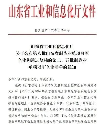 12月4日,山東省工業和信息化廳公布了第八批山東省制造業單項冠軍企業名單,亞太森博“白底(屋頂型)液體包裝紙板”榜上有名。這是繼2022年8月公司“漂白硫酸鹽木漿”獲得山東省單項冠軍產品后又一重要突破。這不僅是對公司規模發展、精益求精的肯定,更是對公司創新能力和市場競爭力的認可。 山東省單項冠軍企業是指長期專注于制造業某些特定細分產品市場,生產技術或工藝國際領先,單項產品市場占有率位居全省第一位且全國前五位的企業。這些企業代表了山東省制造業的最高發展水平和市場實力。