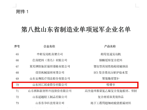 12月4日,山東省工業(yè)和信息化廳公布第八批山東省制造業(yè)單項(xiàng)冠軍企業(yè)名單,共確定358家企業(yè)為第八批山東省制造業(yè)單項(xiàng)冠軍企業(yè),其中淄博市28家企業(yè)上榜。山東博匯紙業(yè)股份有限公司吸塑卡產(chǎn)品成功入圍。