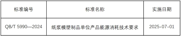 近日,工業和信息化部科技司發布2024年第39號公告,批準發布486項行業標準。其中包括造紙領域行業標準《紙漿模塑制品單位產品能源消耗技術要求》,具體信息如下。