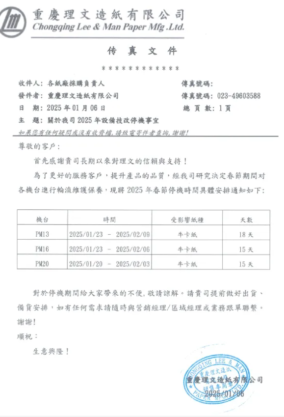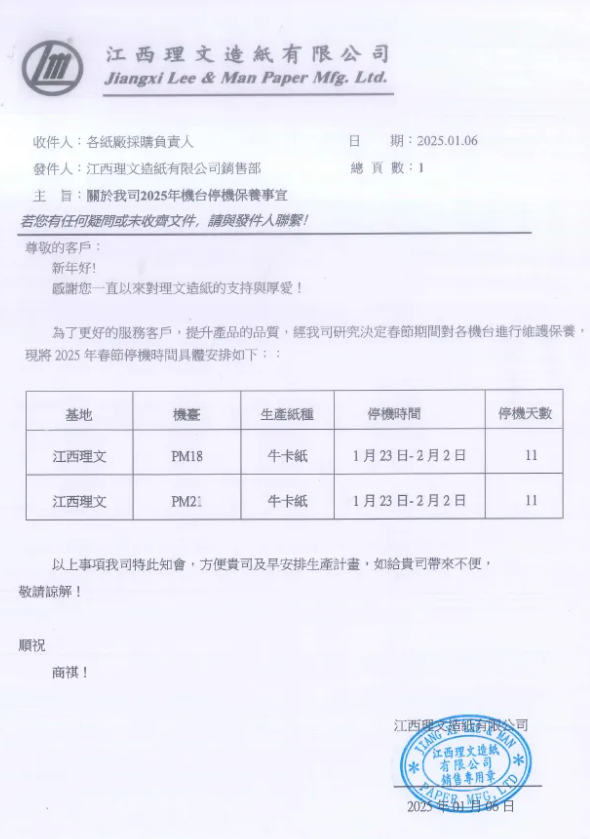 1月6日,理文造紙發(fā)布2025年春節(jié)停機計劃,國內(nèi)四大基地的14臺包裝紙機將在1月中旬至2月中旬期間開展檢修,預計減產(chǎn)26.8萬噸包裝紙,其中包括3萬噸灰底白板紙和23.8萬噸箱板瓦楞紙。