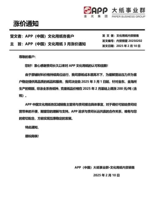 APP(中國)事業(yè)群·文化用紙內(nèi)貿(mào)銷售:由于原輔材料價(jià)格持續(xù)高位運(yùn)行,我司原紙成本居高不下,為緩解營運(yùn)壓力并為客戶穩(wěn)定提供高品質(zhì)的紙品和服務(wù),我司決定自2025年3月1日起,針對(duì)金東、金海所生產(chǎn)的銅版、非涂全系各紙種、克重紙品價(jià)格在 2025年2月基礎(chǔ)上調(diào)漲200 元/噸(含稅)。
