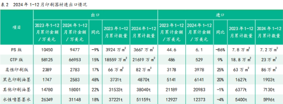 (1)版材 1)PS版 2024年1—12月,出口PS版3667萬m2.金額9477萬美元,金額同比下降9%。2023年同期出口PS版3924萬m2.金額1億美元。 2024年1—12月,進(jìn)口PS版7.2萬m2.金額6.1萬美元,金額同比下降86%。其中,1月從印度進(jìn)口到河南6.9萬m2.金額3萬美元。從日本進(jìn)口3113m2.金額 2.5萬美元。 2023年1—12月,進(jìn)口PS版7.8萬m2.金額44.6萬美元。其中,從日本進(jìn)口7183 m2.金額31萬美元。 與出口相比,PS版進(jìn)口數(shù)量和金額均較少。 2)CTP版 2024年1—12月,出口CTP版2.2億m2.金額6.7億美元,金額同比增長15%。 2023 1-12月,出口CTP版1.9億m2.金額 5.9 億美元。 2024年1—12月,進(jìn)口CTP版23萬m2.金額529萬美元,金額同比增長9%。其中,從日本進(jìn)口7.3萬m2.金額450萬美元。 2023年1-12月,進(jìn)口CTP版18.8萬m2.金額486萬美元。 3)柔性印刷版 2024年1—12月,進(jìn)口柔性印刷版86萬m2. 金額約4000 萬美元,金額同比增長25%。 2023年1—12月,進(jìn)口柔性印刷版63萬m2.金額3178萬美元。 2024年1—12月,出口柔性印刷版82萬m2.金額2783萬美元,金額同比增長17%。 2023年1-12月,出口柔性印刷版66萬m2.金額2389萬美元。 (2)油墨 1)黑色印刷油墨 2024年1—12月,出口黑色油墨4870t,金額2583萬美元,金額同比增長48%。 2024年1—12月,進(jìn)口黑色油墨1903t,金額6141萬美元,金額同比增長20%。 2)其他印刷油墨 2024年1—12月,出口其他印刷油墨3.8萬t,金額1.8億美元,金額同比增長22%。 2024年1—12月, 進(jìn)口其他印刷油墨7130t,金額2.1億美元,金額同比下降1%。 (3)水性噴墨墨水 2024年1—12月,出口水性噴墨墨水5.1萬t,金額3.1億美元,金額同比增長18%。 2024年1—12月,進(jìn)口水性噴墨墨水6000t,金額1.2億美 元,金額同比下降4%。 3. 印刷品 2024年1—12月印刷品進(jìn)出口數(shù)據(jù)如表3所示。