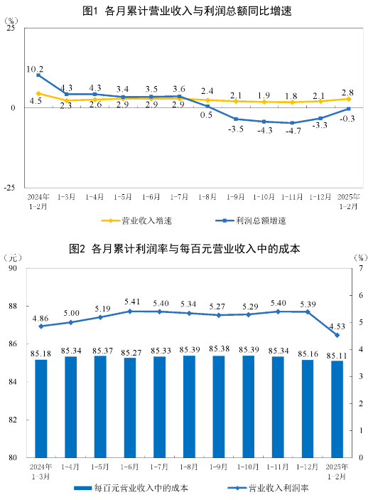 1—2月份,規模以上工業企業每百元營業收入中的成本為85.11元,同比增加0.11元;每百元營業收入中的費用為8.56元,同比減少0.09元。