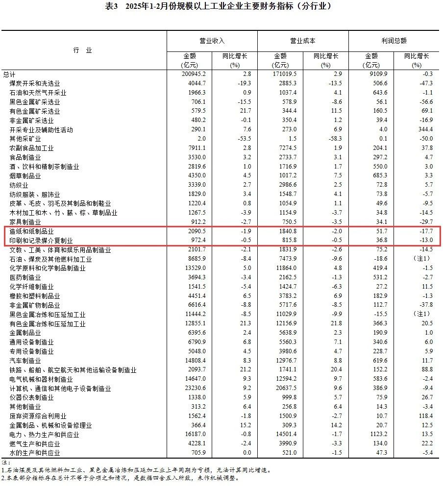 值得關注的是,2025年1—2月份造紙和紙制品業實現營業收入2090.5億元,同比下降1.9%;實現利潤總額51.7億元,同比下降17.7%。